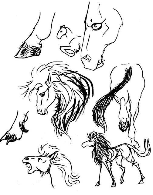 Preliminary sketches for a Tasgard horse — an unusually leonine equine because of the Horse spirit’s death and these horses’ subsequent adoption by the Lion spirit. They are skinchangers but avoid changing to keep from becoming more leonine. Aggressive, usually herbivorous with scavenging tendencies, but happy to make a meal of you if you irritate them. Used as warhorses by the Risen Phoenix Empire.