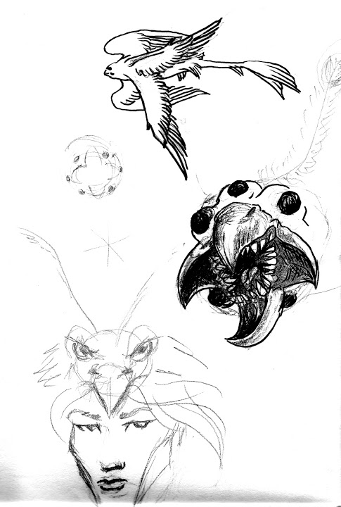 A few scraps from the artist, of various critters we’ve previously discussed, like quillwolves: