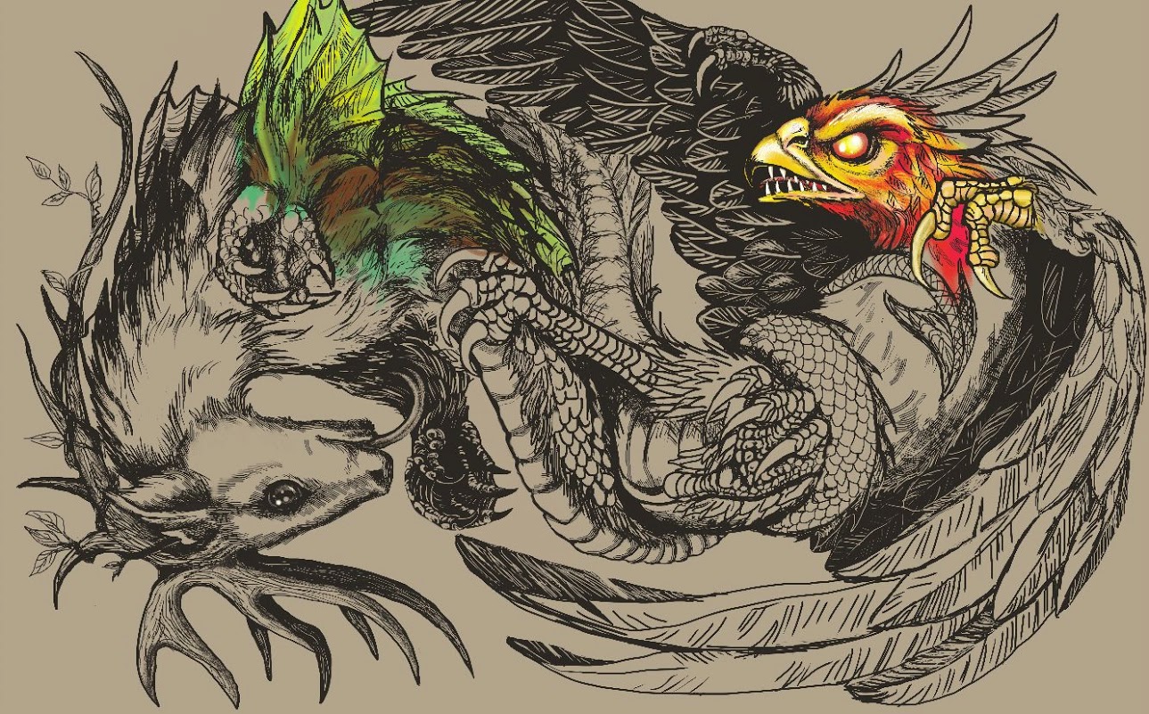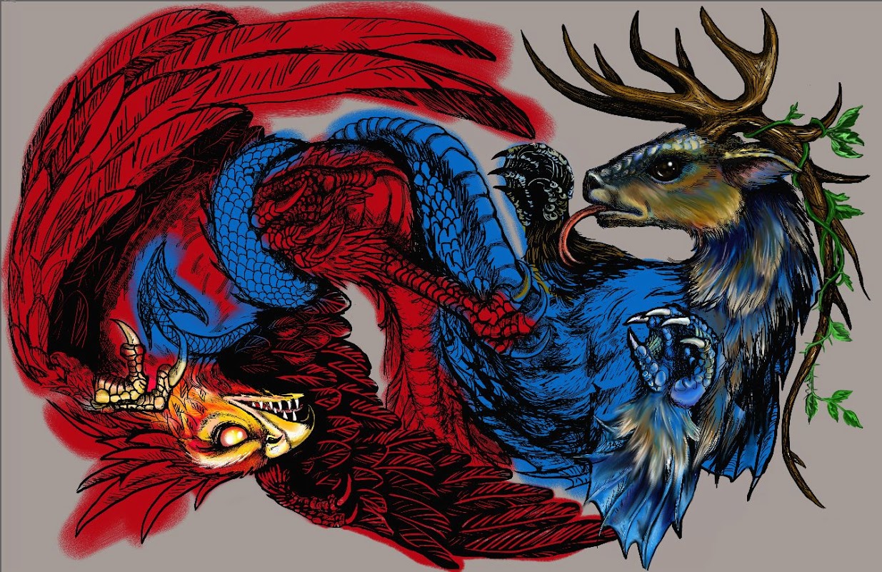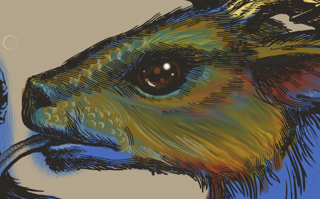She put down the base colors as per my specifications, and we talked about adding scales to the Guardian’s face and what should be going on with its mouth area.