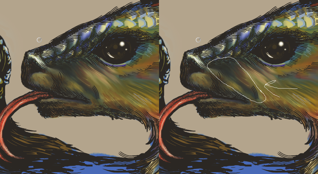 More scales, which I liked (though I didn’t so much like the ones on the lip area), plus an eye design that I vetoed in favor of the inkdrop eye from earlier.