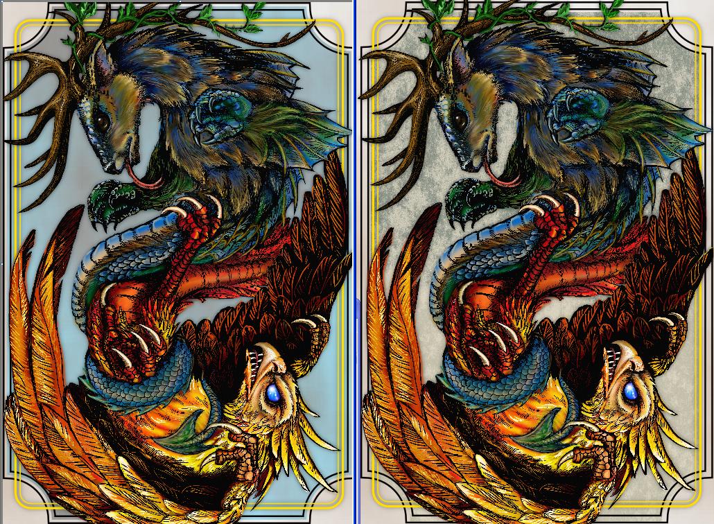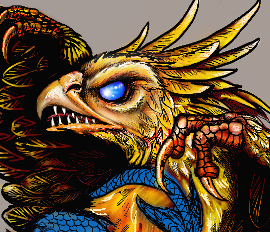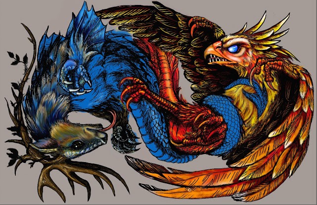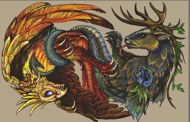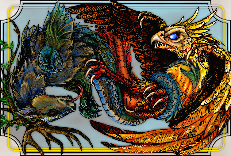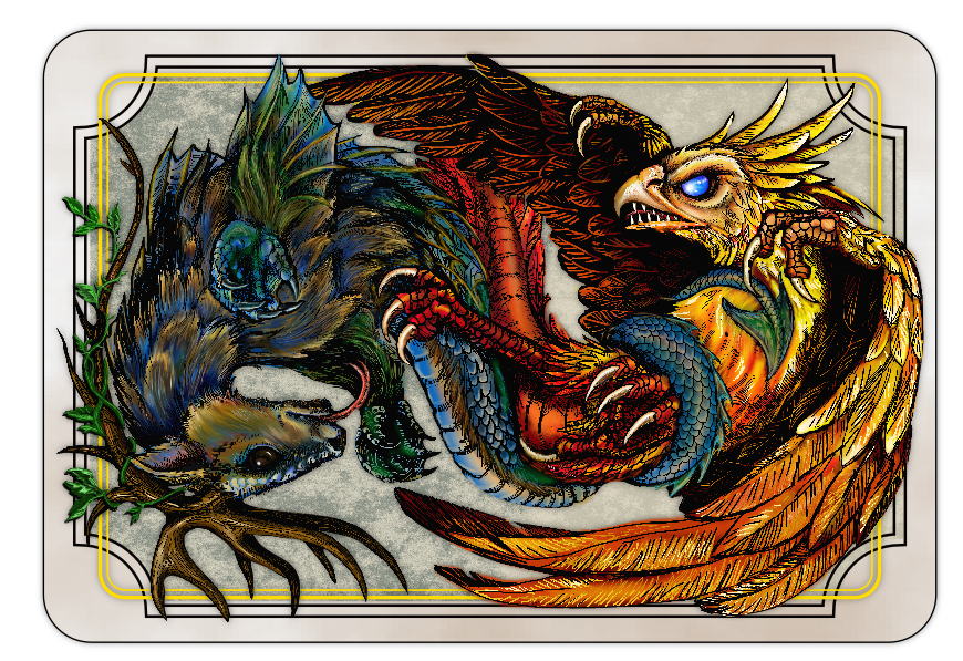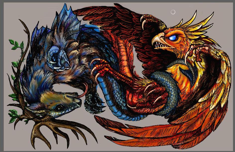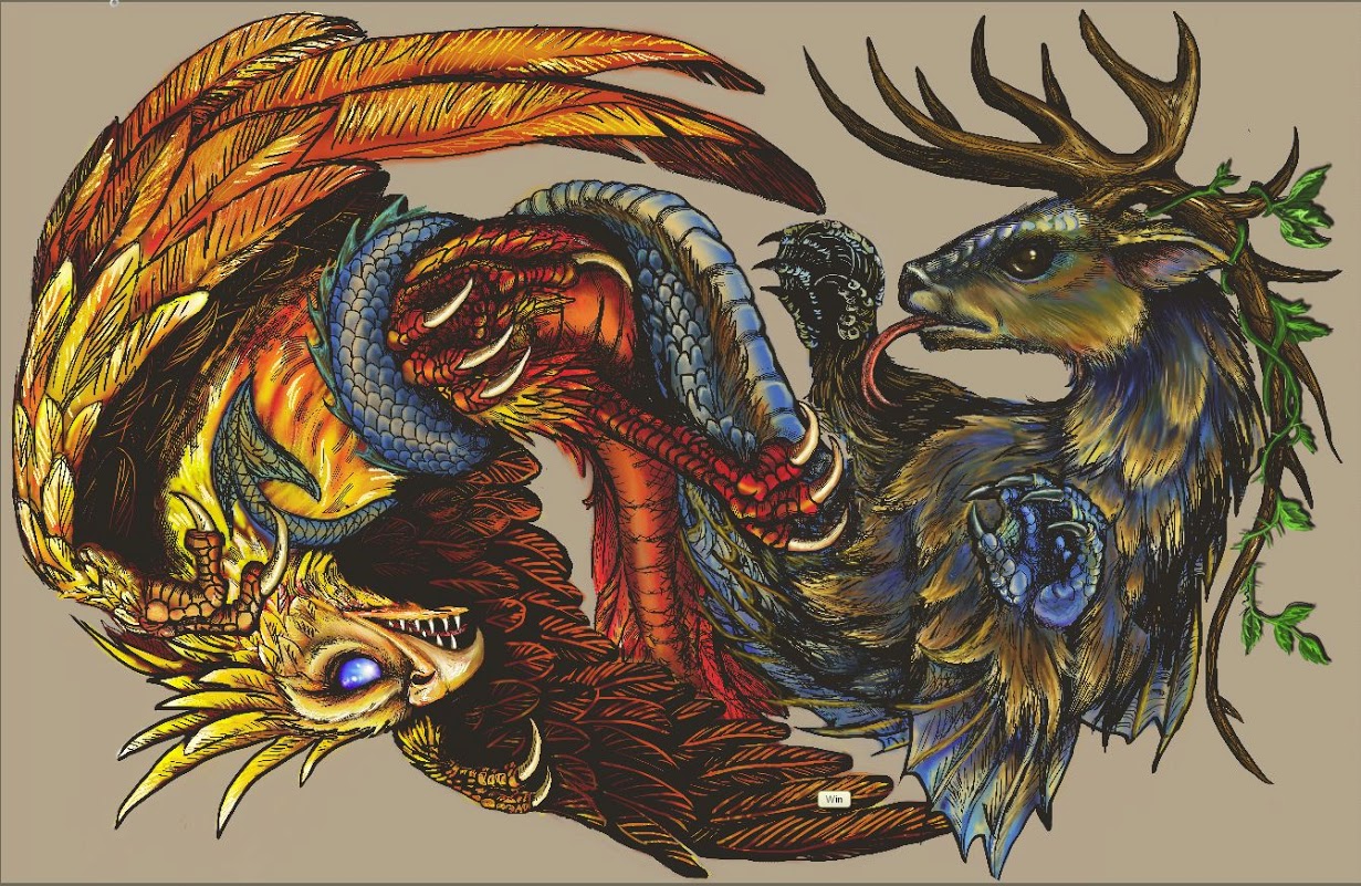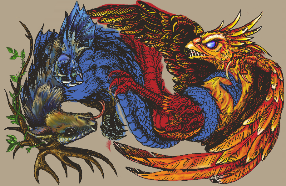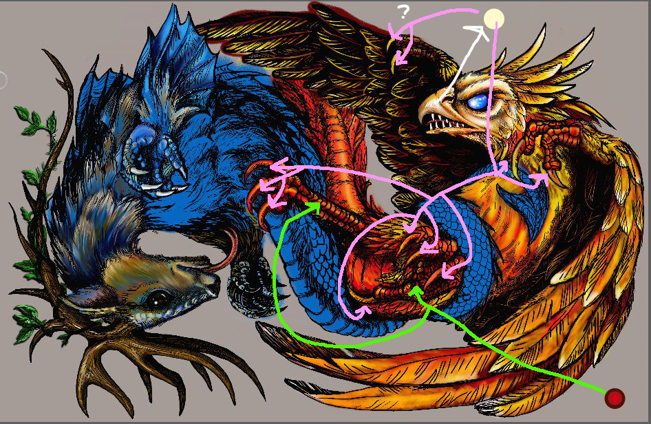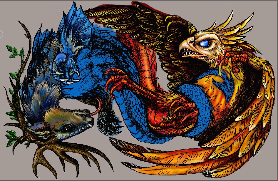 This is where we began the Duel of the Ravager’s Coloration. (The Ravager is the big red-gold bird, by the way.) I liked some of the examples, disliked others, so we experimented!