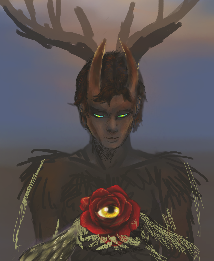 I will tell you right now that I have a very clear idea of what Cob’s face looks like when he’s twenty-five. The problem is that he’s currently seventeen, and I requested a weird angle so that he’s looking down at the rose instead of up at the viewer, which has made it tricky for both of us to judge how he looks.