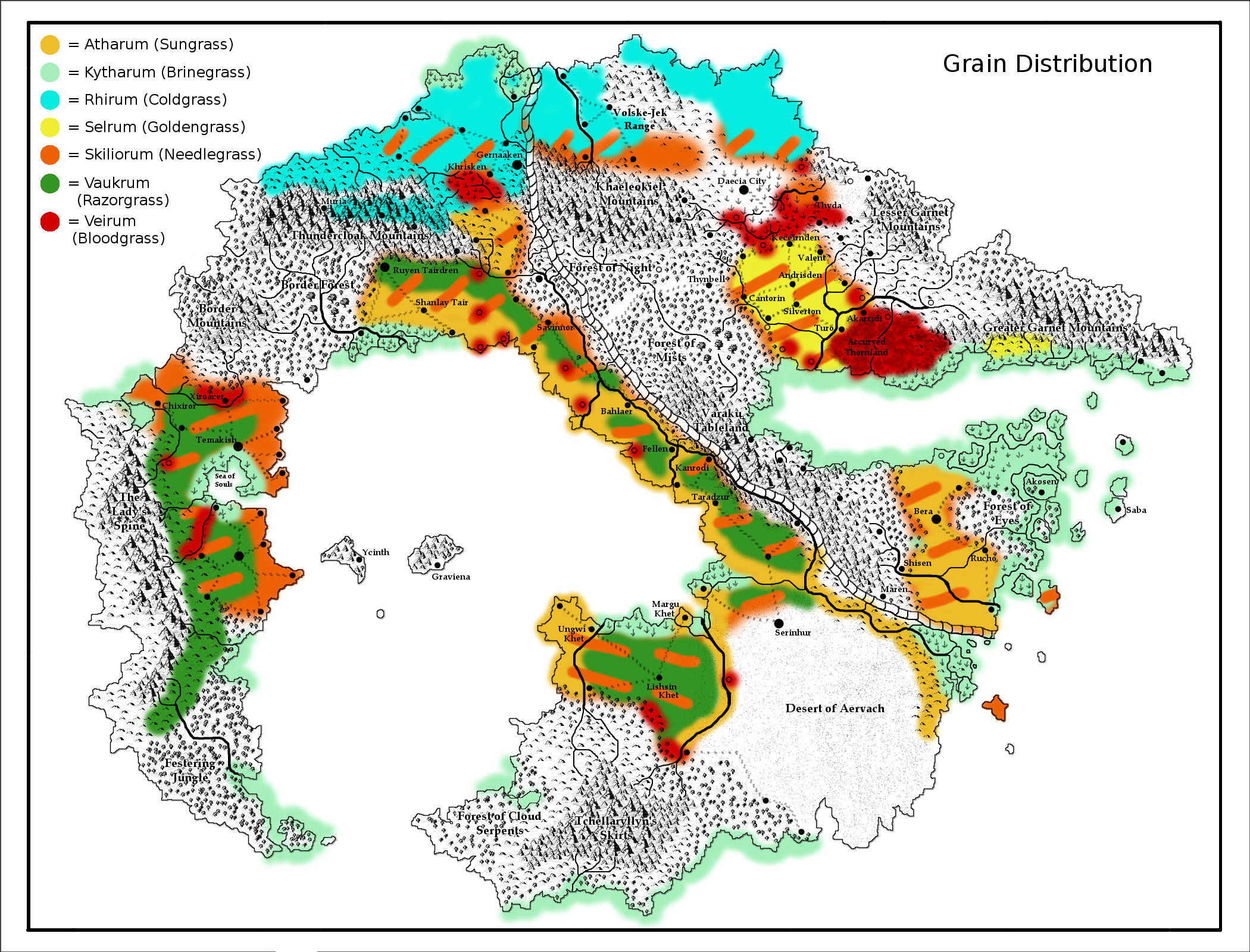 So. The grain map tells me where the high-producing grains are concentrated (the light yellow and goldenrod-colored ones) and where the grassland is mainly composed of low-producing or difficult-to-harvest grains (orange and dark green). Also, this only measures the potential growing range for those grains, not their actual distribution; not all of this territory has been cultivated.
