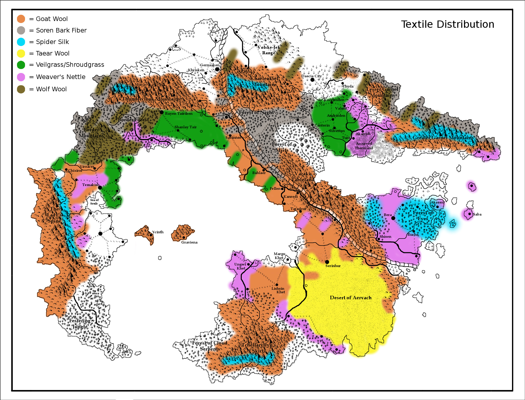 As for the textile map, my world has a lack of: sheep, silkworms, flax, cotton and hemp. Therefore the textile options are different. Goats take the sheep niche; spider-folk cover somewhat for silkworms; several less-than-ideal plant-based fabrics are used in the goatless areas; and wolf-kin regularly brush out their wolf relatives to card their excess fur into wool. Also, the southern clans weave cloth from the fur of the taear (the ‘whales of the desert’). This creates some large gaps in good fabric availability (namely the green, grey and pink areas, plus the orange areas just show where goats are, not necessarily where they’re reachable), thereby driving trade.