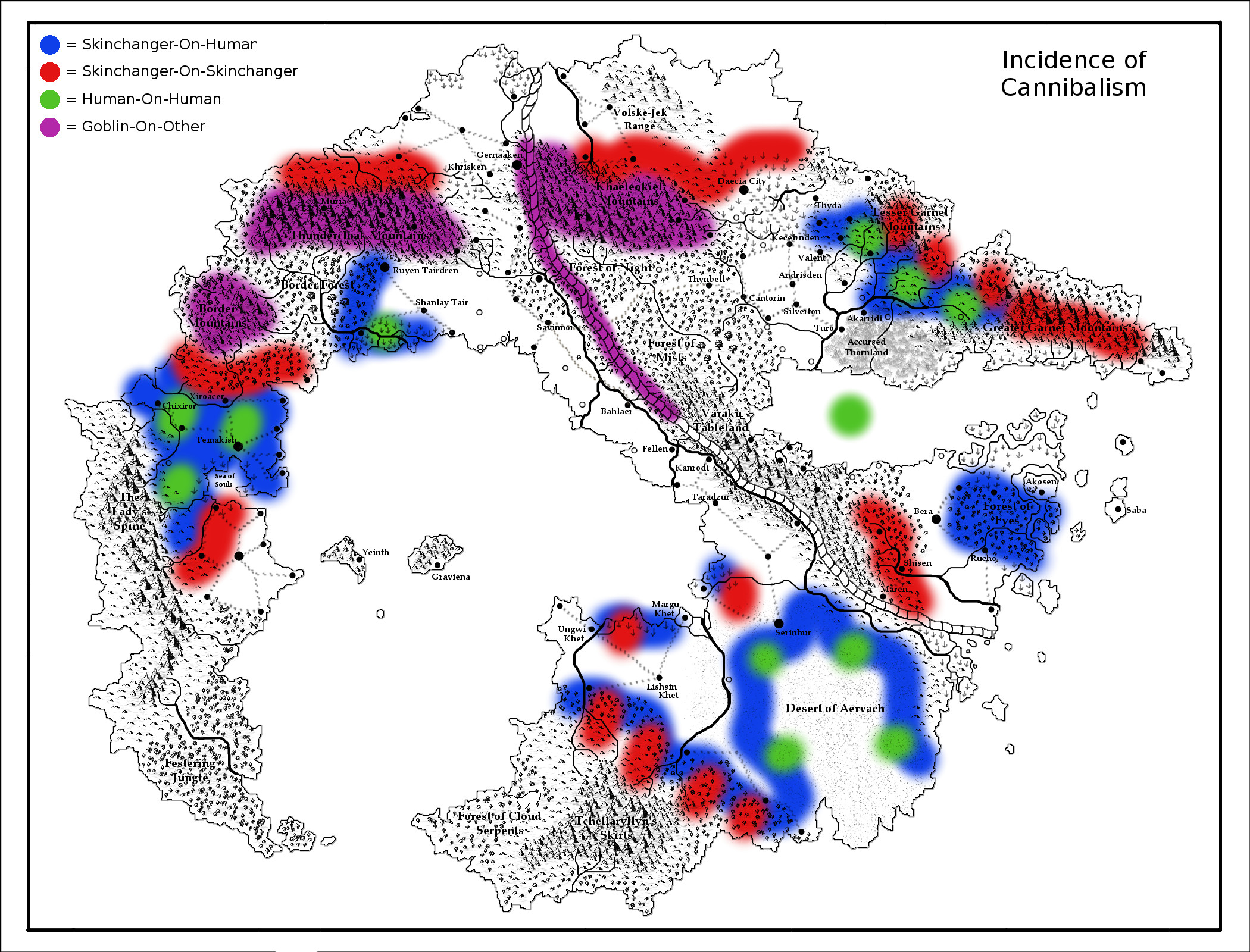 Green zones, with what some would consider ‘true’ cannibalism, are largely a creation of local pressures. They come about when there are pro-skinchanger/beastfolk humans among the skinchanger/beastfolk forces attacking human settlements — for instance in the northeast, where human wolf-kin are perfectly happy to eat what their skinchanger brethren bring home no matter what those kills are. In the southern desert, competition for food and resources is such that sometimes the human tribes use cannibalism as a last resort; in Xiroacer to the west and the White Isle in the center-east, human slaves eat what they are given, whether they like it or not. Finally, the spot in the upper middle indicates the psychotic swamp-folk, who may or may not know what they’re doing.