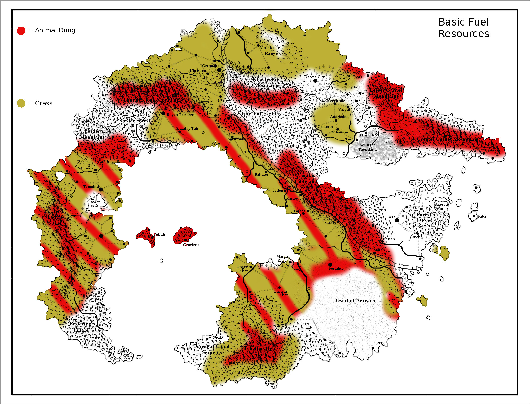 There is significant overlap between the two, of course. Places without grass- or dung-use are either places that don’t use fuel (the lizardfolk jungles in the south and the skinchanger- and wraith-controlled forests, because none of them bother to cook) or places with domesticated animals and crops unsuited to these uses. Or the (sandy, not scrubby) desert.