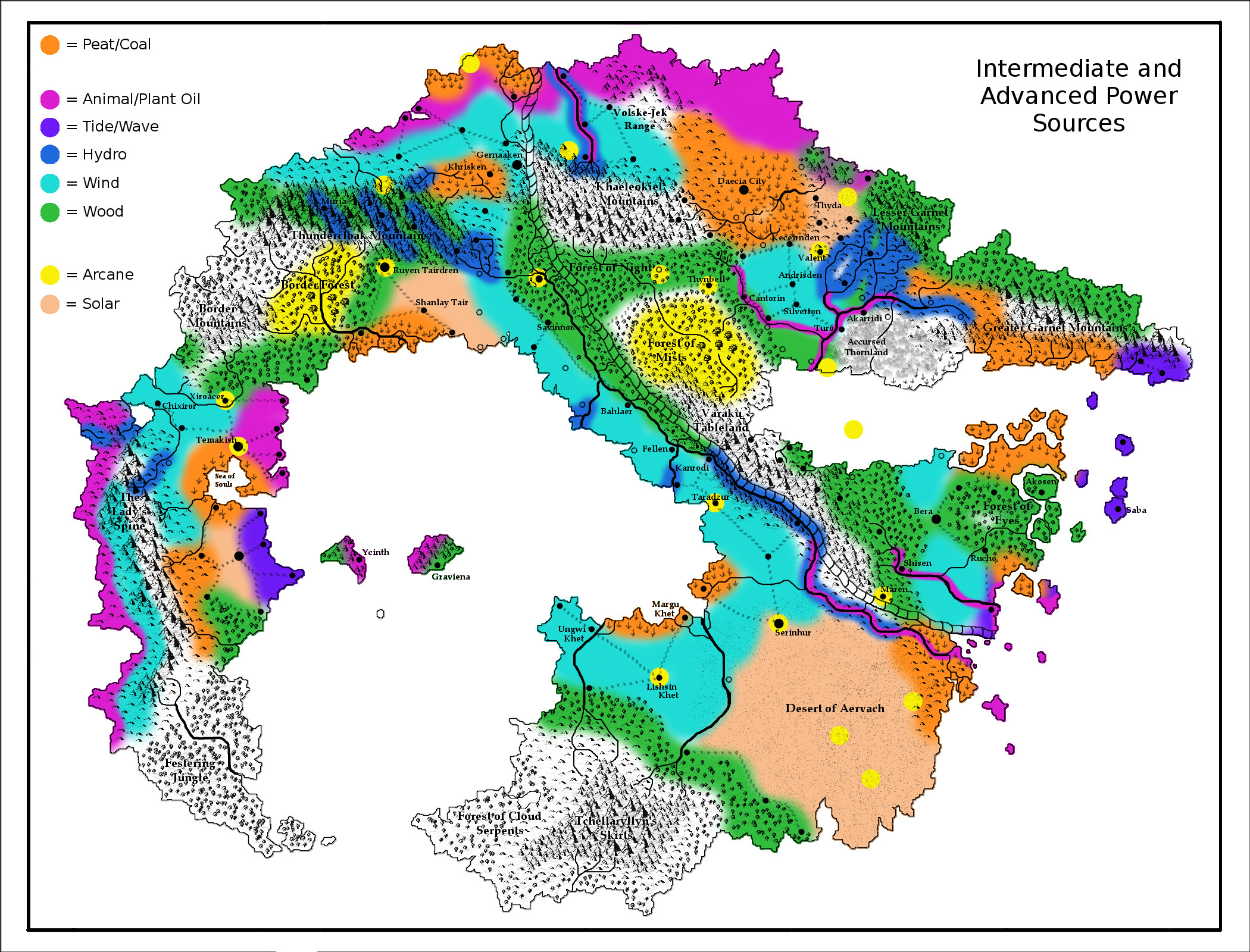 There are some tweaks to the distribution, because I decided to focus on what’s in use now — though the coverage of wind and solar power are still idealized levels. Notably, tide/wave power has a diminished range, geothermal has been removed (to concentrate on surface-dwellers), solar now covers the southern desert instead of arcane, and I picked out a few more spots of peat- and animal-oil use that I’d overlooked previously.
