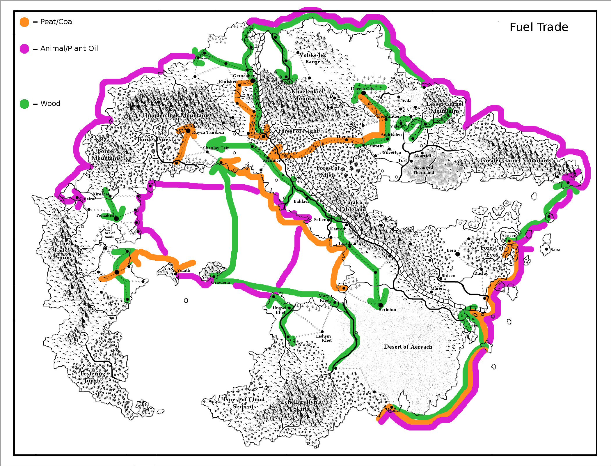 Since both of those maps only cover where the fuel/power is created or harvested, I traced some of the trade routes from an earlier map to figure out what fuel sources are currently shipped where: