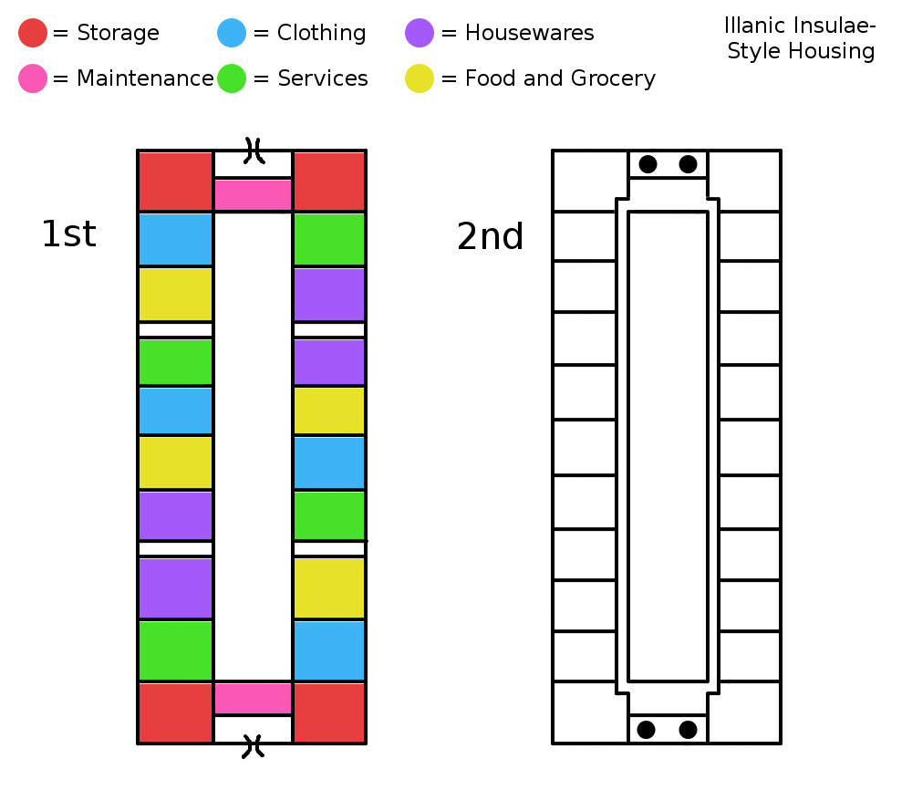 So but yeah, these are not the ill-built ancient Roman insulae, but meant to be a block long with an inner courtyard/communal garden (along that white strip in the middle of the colored diagram) and walkways, staircases I forgot to draw in, etc. The apartment sizes will get smaller with each level to provide those walkways, so that the second floor is family/prosperous housing while the top floors are for couples without children, singles, or really cheap people. Water from an apartment fountain or spigot in the courtyard or from further up the street from a communal fountain; probably there are apartment service personnel who can fetch water for a price. Most urban Romans lived in places like this (sans the courtyard/garden) so it’s feasible. I already have much of it written in.