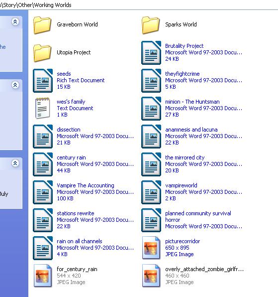 The only one that’s even a vaguely finished product in there is Vampire: The Accounting, but I gave up about 1/3rd of the way through editing it, because I didn’t really like it anymore. Oh, I like the ideas (it’s a vampire parody, obviously), but ehh…not so pleased with my execution. And anyway, I have the War of Memory Project to work on.