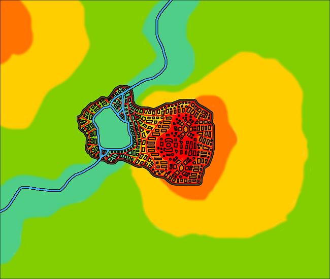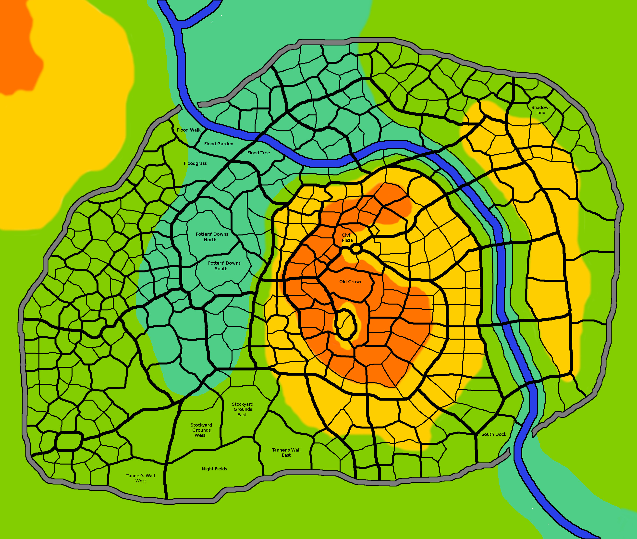 If you zoom in on this map, you’ll find the Potters’ Downs (in the flood-prone basin where the old lake used to be), the Night Fields (on the south edge and hopefully downstream/downwind of everyone, possibly with its own gate and more proper fields outside the city limits), Tanner Wall, Old Crown up there in the ruins of the fortress, a few of the most frequently flooded districts, and of course the Shadowland (which is not just that one lopsided district but several of them in the vicinity, which I’ll probably color-code once I get around to placing actual buildings).