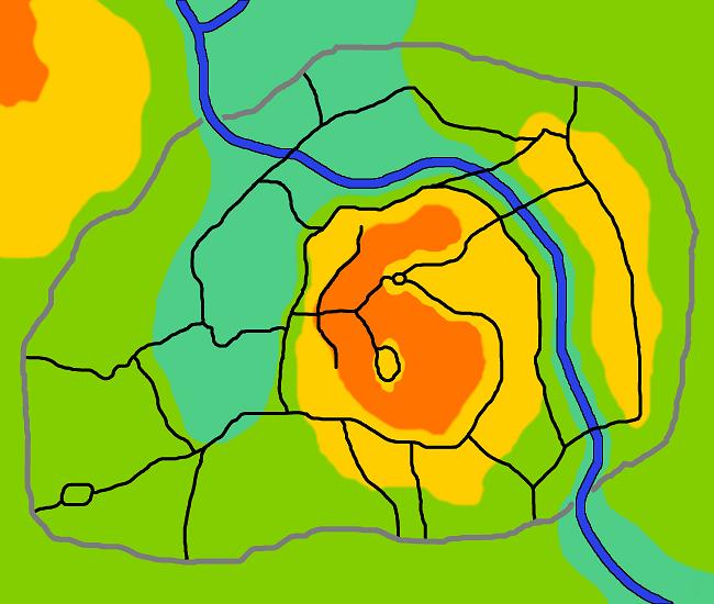I drew a rough line around where all the satellite towns were and declared it the current city wall. Then, acting on advice from The Cartographer’s Guild as usual, I drew in the main roads.