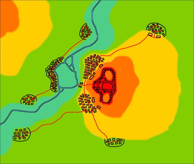 This is early on in the fortress’s life, I think. I sketched in some satellite towns, some of which are built on the bones of Ghezidun and some of which add their own bones to the scene, to be built on later. I’m sure there were more satellite towns and with much greater coverage of the hills and downlands, but as they’re on a border that became a serious conflict-area, many of them have been erased due to the regular cycle of conquering and razing.