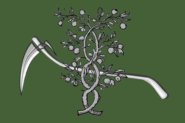 Illane is the most recent protectorate, though it doesn’t feel very protected; it’s currently occupied and where half of the action in the first book takes place. It’s also only nominally a cohesive land, because in truth it’s a loose collection of city-states that don’t bother with each other much except for trade. This is the accepted symbol for the lot of them, though each city-state has its own personal flag — scythe for the farmland, fruit-bearing branches for the orchards.