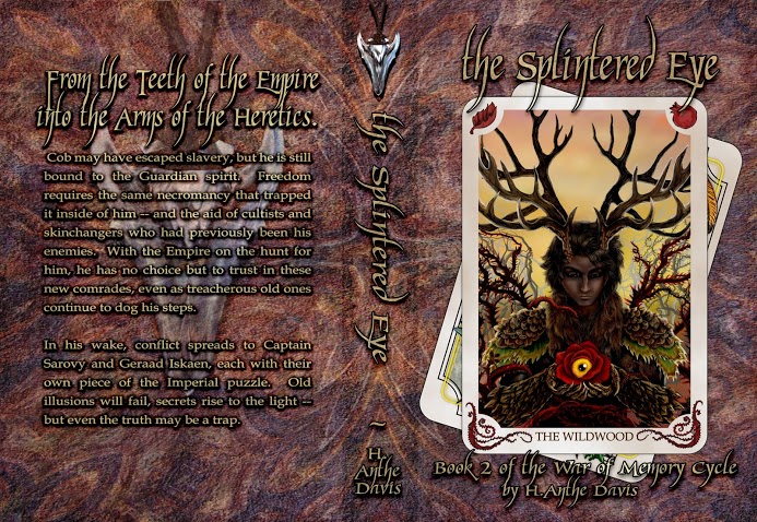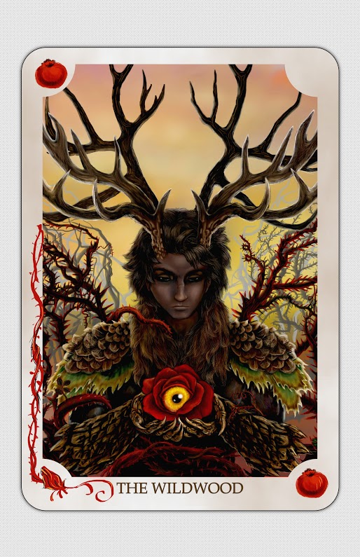 We had a bit of a miscommunication initially, getting all the card components right. Since the cards are from my Halion Tarot deck, which has six suits and court cards as well as common cards, the icons in the corners were meant to represent the card that this would normally be: the Queen of Staves (which is part of the spread Cob got in book 1). The leaf in the above card represents the Staves or Wood element, while the pomegranate represents the orb of the Queen cards.