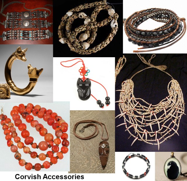 Most fox skinchangers in clan situations will remain in human form when not hunting or fighting, and wear a reasonable amount of clothing, but they always have their tails. Thus Corvish fashion tends to involve either tail-holes or long tunics that don’t necessarily require breeches. While much of their gear is rough leather, they also trade for cloth with Darronwy and Averogne and across the mountains with Krovichanka, and decorate their ceremonial gear with mementos of their hunts.