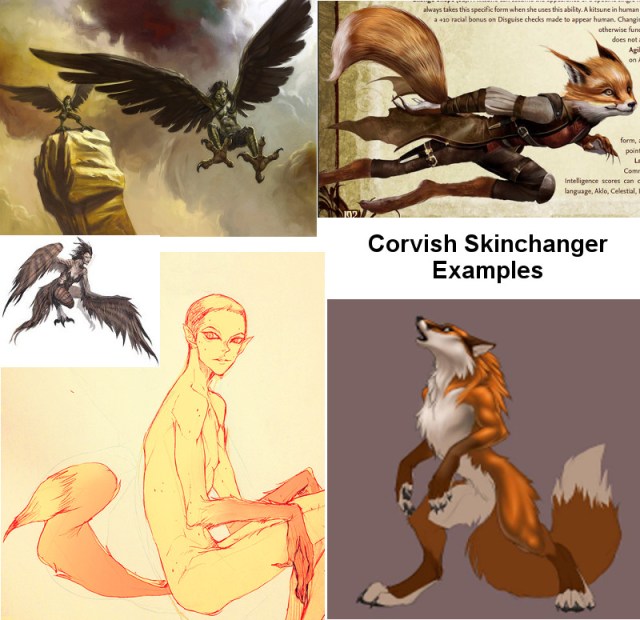 The physical aspect being due to the fact that a large proportion of the Corvish population is skinchangers. All animal life on this world originated as skinchangers, capable of shifting their form at will; as time went on, certain groups modified themselves to fit certain niches, and became bound to splinter-spirits rather than the original Great One — thus restricting themselves to that certain niche form. The mixing of two skinchangers of different bloodlines creates unshifting humans, and that hybridization is dominant in most parts of the known world — but not in Corvia.