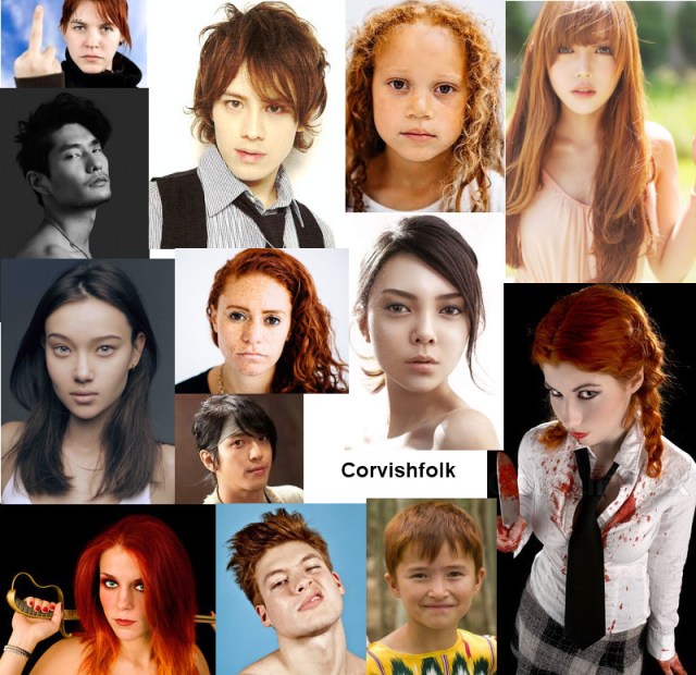 Corvishfolk come in two types: the Red or fox-blood Corvish, also called khirinain, and the Black or crow-blood Corvish, also called t’okielain. Red Corvish usually have russet hair and dark brown eyes, while Black have black hair and yellow eyes, but there is a decent-sized human population with mixed traits — including brown or even blonde hair, though blondes usually dye their hair black to avoid fierce anti-Wyndish discrimination. In all, there are about equal proportions of the three types: fox skinchangers, humans, and crow skinchangers.