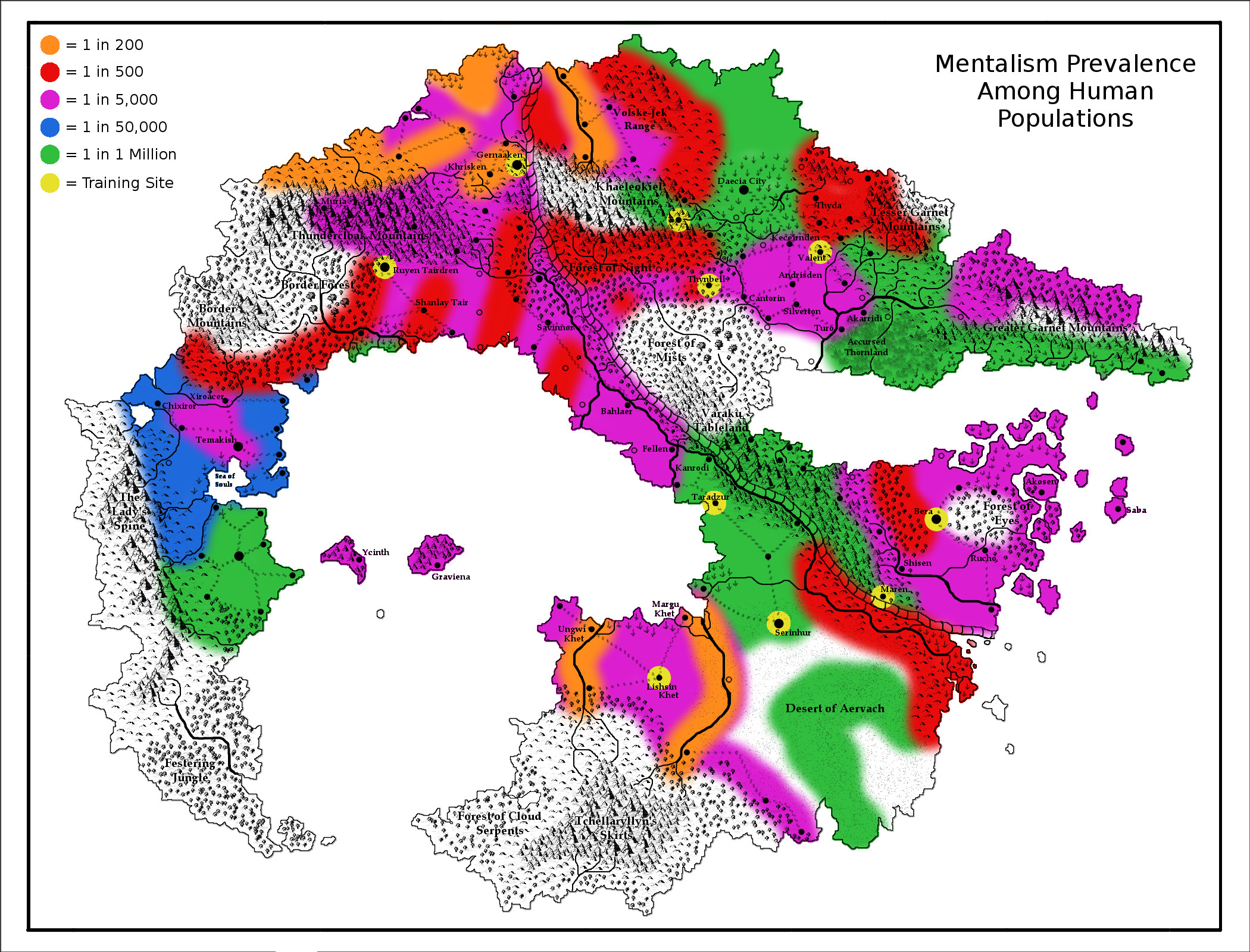 This map is a very rough estimate of mentalist prevalence in the known world, based on population distribution of the various beast lineages. As mentioned, mentalism is overwhelmingly a product of herd- and pack- (and flock-) related lineages: Deer, Wolf, Horse, Lion, Crow, Bull, Boar, et cetera.