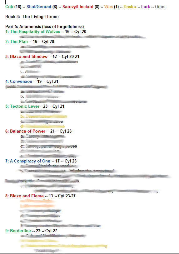 As you can see, there are three chapter-level threads: Cob’s, Sarovy’s and Geraad’s. It’s this way throughout almost all of the book, with one of those three characters ‘heading’ the chapter and the occasional other person on their strand popping in to provide a POV section (like the orange and yellow smudges for Weshker and Dasira). As we go along, more and more of those others jump in to add their two cents, because though those three men are the ‘leaders’ on their thread, they’re not necessarily the most important characters at any given time.