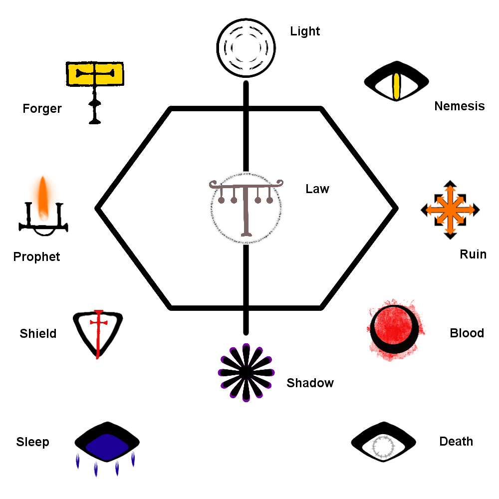 Not all of these symbols are the greatest, or accurately portray what they should be; the Nemesis is supposed to have a golden dagger for a pupil, and the Shadow Lord’s thing should be spikier, not rounded. But I use the GIMP 2 program like a stamp set, so this is what I managed.