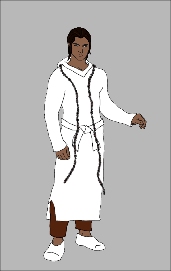 Because of the computer crash, I had to reconstitute my paperdoll file, so only just got back to the project, but I did manage to put together a quick Cob-as-pilgrim pic, circa book 3. The pilgrim robe is a simple off-the-rack pull-on affair — nothing like a Light priest’s robe, which I’ll do next.