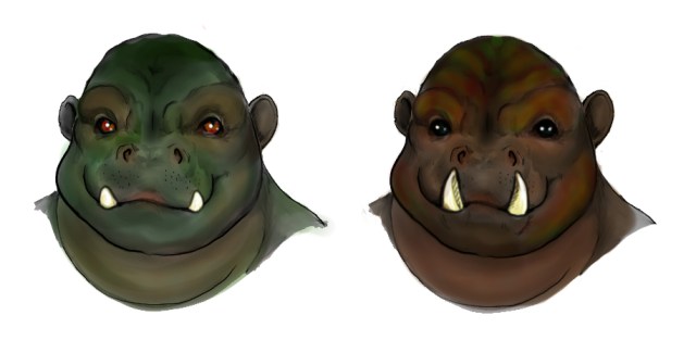 At this point, I realized that some of the tusk-styles fit best for certain ogre tribes — since I’ve mentioned before that one tribe has very protrusive ones, to the point of even their mixed-blooded human kin having visible tusks and trouble with human speech, while another type has little stub tusks that sometimes don’t even show.  So I badgered her to colorize them, and after a few steps, she came up with these: