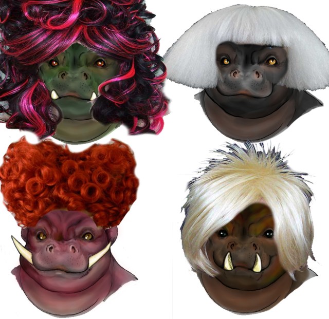 And after that, I mentioned how ogres are jealous of the smaller folks because the smaller folks have hair or fur or feathers and the full ogres are all bald, and how they really like to wear wigs…