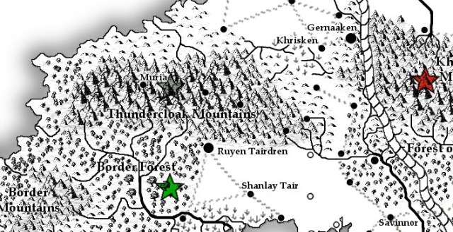 On the map above, Muria and Ratrangas Garta are sited at that hard-to-see grey star. Like the red star (Aekhaelesgeria) and the green (Du’i Oensha), Howling Spire is a Seal — one of the six elemental points that maintain the barrier that keeps Outsiders from invading the planet. Kerrindryr sprawls in all directions through the mountains around it, with the eastern end being the Low Country and the mid- and western portions the High Country.