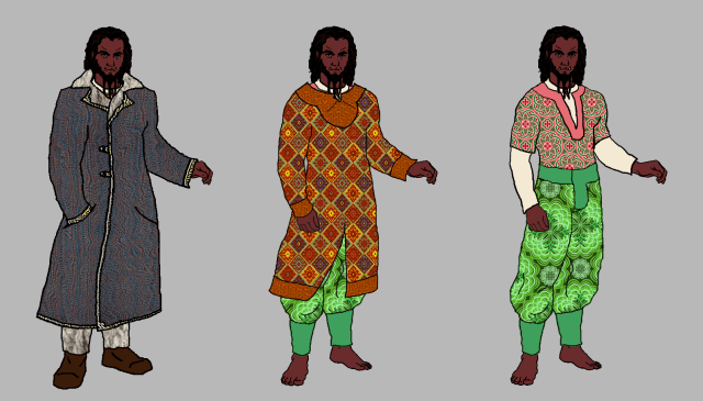 Despite these lifestyle divides, Gejaran attire is itself a long-standing blend of southern ogrish and northern human styles. Ogres have always favored large, loud, bold patterns, while northern humans tend toward long layers and practical wraps. In combination, Gejarans tend to be quite easy to pick out from a crowd, particularly when wearing the now-traditional tapestry coats and robes. Some say that those came about when the original ogrish refugees had nothing large enough to clothe themselves in except the natives’ traditional loomwork tapestries. Others think they just like the look of the big bright pictures.